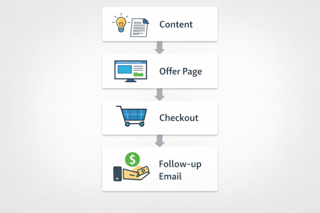 On the back end, you’ve got a simple landing page or blog post that explains the next step, a checkout or booking page that actually works, and a handful of follow-up emails so the relationship doesn’t die if they don’t buy on the first click.